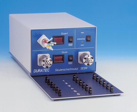 One part of the device is a selector to choose one of six columns into the liquidstream. Column and solvent position can be selected independently and individually. For an easy integration into a complete HPLC-system an I/O port enables the external selection of a column or solvent and the control is made by contact closures or TTL-pulses. As an option a BCD-control-board can be included to adapt the device to a HPLC-systems with only 4 timed events, e.g. Agilent 1100 or WATERS Alliance.